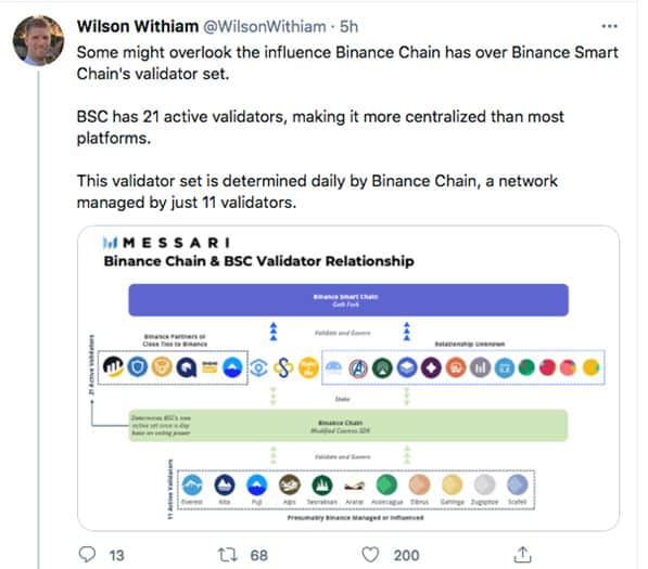 A researcher from the crypto research firm Messari has pointed out towards the lack of decentralization in the staking mechanism of BNB. The researcher, Ryan Watkins, vocalized his disdain for the Binance community for leading inexperience investors awry with narratives of decentralization. Watkins further bashed the network, stating the speed of BSC is not because of any technological innovation but rather due to its centralization. Watkins further called BSC a centralized Ethereum fork.