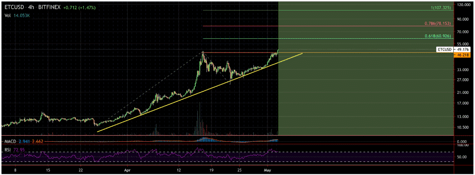 A trader has identified important Fibonacci retracement levels for Ethereum Classic. Per the trader’s analysis, ETC coin has been on an uptrend – following an ascending trendline. Ethereum Classic has broken the first important level of resistance at the price level of $46. The next crucial resistance level lies at the 0.618 Fibonacci level parallel to the price level of $60, followed by 0.768 and 1 Fibonacci retracement levels at $78 and $107 respectively – setting the levels as price targets. The overbought Relative Strength Index is returning back to normal levels, hence, a pullback may be expected.