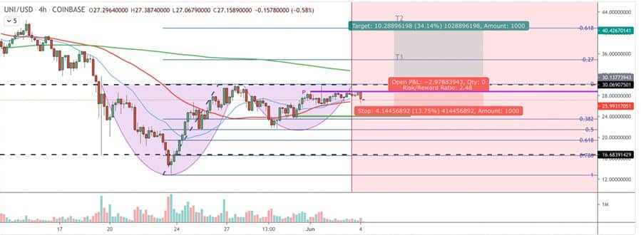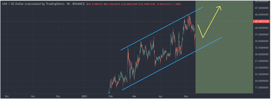 A trader has pointed out towards the formation of an ascending channel. Uniswap coin has been oscillating inside the channel formation since February. The upper and lower boundaries of the formation are acting as strong resistance and support levels, respectively. The market had taken a downturn as the Uniswap crypto began a downward move in the channel. However, the trader predicts an upward break out from the channel formation after such pullbacks towards the lower boundary. The breakout from the channel will place Uniswap at a price target of $47.