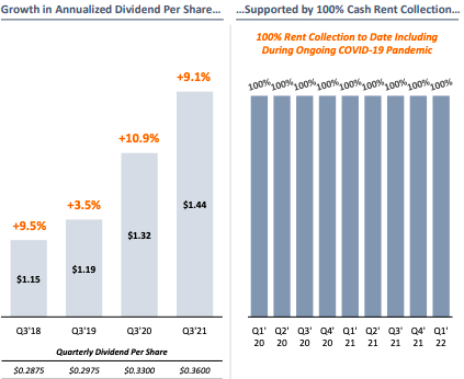 Over the last few years, VICI has proved its resiliency despite the pandemic bringing economies to a halt. The company collected 100% of its rent throughout the pandemic due to its operating excellence and liquidity of tenants. 80% of the company’s rent roll is on the S&P 500. The company has also continued growth in its annualized dividend per share as seen in the company charts below: