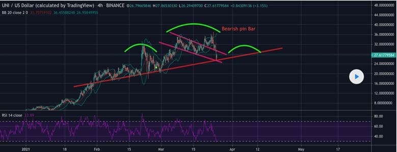 Uniswap (UNI) coin has embarked on an uptrend since the beginning of the bull run. The cryptocurrency established its all-time high at $33. However, the price of Uniswap is currently suffering from some major pullbacks. As of this writing, Uniswap stands at $27. The price has decreased in the past 24 hours by 13% while the daily trading volume has gone down by 33% – effectively showing that the market for the cryptocurrency is in correction.